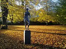 "The Fated" was produced by sculptor Johannes C. Bjerg in black, finely sanded, granite from Bornholm. It stands in the center of the tree rotunda where it was placed on 26 May 1955 after it was donated to the city.[4] "Waking Woman" is a bronze sculpture modelled by Kai Nielsen in 1920, depicting a young women waking from a sleep, or alternatively, symbolizing the woman waking in the girl. The statue originally stood in front of Atletion but after a fire in 1943 it was moved and placed here in the park in 1948.[5] "Girl of 1940" is a life-size bronze sculpture made by Svend Rathsack and placed in the park by Aarhus Municipality in 1941. The aerial bombardments during the Second World War inspired the statue, depicting a young woman defensively holding her arms above herself.[6] "Atalanta", another bronze sculpture, depicts Atalanta from Greek mythology and is placed in the southern section of the park. It was made by sculptor and professor Einar Utzon-Frank in 1919.[7]