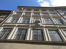 In connection with the 1751 renovation, Brolæggerstræde 13 was converted into a five-storey building by lowering the ground floor almost to street level and changing floor heights. The plastered facade is finished with sill courses below the windows on the first and second floors and a dentillated cornice. Doors are located in the two outer bays and the slightly recessed ground floor windows between them are placed in each their niche. A short perpendicular window projects from the rear side of the building.[31]