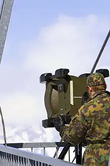 The R-905 is a microwave transmission station that is used in the Swiss Army. The directional station consists of a transmitting and receiving device (SE R-905) - in which the antenna reflector is also integrated - the operator terminal (BT) - a handset with keypad and LCD - and a supply equipment (SA 95/1). There is a 24V battery, a tripod with strap-down ropes and a camouflage net. All mentioned equipment and material adds up to about 230 kg but can be carried by troops separately, or can be loaded on to a mule.