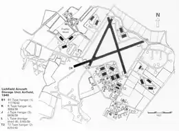 RAF Lichfield, known locally as Fradley Aerodrome, was constructed in from mid 1939 to 1940. The airfield was set out in the usual triangular pattern with two runways 1 km in length and a main runway of 1.46 km.[1] Initially it operated as a maintenance site, being home to the No. 51 Maintenance Unit from August 1940.[2] Manufacturers sent newly built aircraft to Fradley to carry out any modifications before delivery to squadrons. After the war, large numbers of aircraft were broken up and many aircraft were prepared before being sold to the air forces of other countries. The unit remained active until the closure of the airfield in 1958.[3]