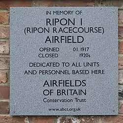 During the Second World War, RAF Dishforth, some 4 miles (6.4 km) to the east of Ripon was also commonly known as RAF Ripon due to its proximity to the town, but this was a purely unofficial name.[4] The town also had another civilian airfield, due south of the city, that existed briefly in the 1920s.[12]