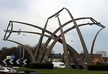 The airfield closed in 1958, and in 1960 the site and that of the British Industries Fair, plus nearby farmland, was sold for housing. The runway was broken up, the buildings were demolished, and construction of a Birmingham overspill estate (Castle Vale) started in 1964, and completed in 1969.[14] All that remains today are, a stained glass window in the estate's church, streets and housing blocks with aviation names, a row of ex-RAF houses along the Chester Road, and a Spitfire Memorial. This is a large steel sculpture called Sentinel designed by Tim Tolkien which was erected in 2000 on the roundabout (island) where the road to the estate joins the Chester Road. The roundabout was subsequently renamed Spitfire Island.