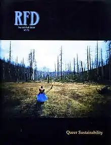 RFD is a reader-written quarterly magazine celebrating queer diversity. Founded in 1974 as a publication for gay country-living and alternative lifestyles, the magazine has been edited by different communities in various locations since its inception; it is currently published in New England. While predating the Radical Faeries, the magazine and the movement have long been associated. Notable writers featured in RFD include the poet Essex Hemphill.