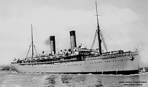 RMS Balmoral Castle, was launched in November 1909 and, after being fitted out, went into the Cape service, as the largest, most powerful and one of the most luxurious ships in service south of the equator.[1] Among other voyages, commanded by vice-admiral Wemyss, it conveyed the Duke and Duchess of Connaught to open the Union Parliament in October 1910.[2] In August 1914 it was one of six ships that each carried 1,000 troops under escort from Capetown to Tilbury Docks, preparatory to their being sent to the war in France and Belgium.[3] The following year it continued on the Cape run, presumably in convoy, escorted by cruisers such as HMS Highflyer, on account of the U-boat menace. In 1918 she acted as flagship of a flotilla of troop carriers bringing soldiers from America and Canada to London.[4] After the Armistice she was employed ferrying Australian soldiers from England to Australia, and with the resumption of trade, carrying wool and wheat on the return journey.
