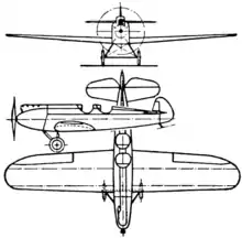 The RK.25 had a traditional fixed undercarriage with a track of 1.40 m (55 in), its mainwheels on a single axle supported by a pair of V-struts from the lower fuselage.[1] The tops of the forward V-strut members were joined transversely by a beam, free to slide vertically between pairs of fuselage members but restrained by sets of rubber rings which also circled the wing structure as it crossed the fuselage.[2]