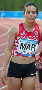 Rababe Arafi (Arabic: رباب عرافي, born 12 January 1991) is a middle-distance runner from Morocco, who specialises in the 1500 metres. Born in Khouribga,[1] she is a three-time medallist at the African Championships in Athletics, having been the continental champion in 2012 with a championship record run of 4:05.80 minutes.[2] She holds the Moroccan national record in the mile run[3] and in the 1500m (3:58.84 minutes - 16 June 2019 - Rabat - Diamond League)[4][5]
