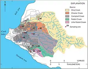 ![]() Anchorage Watersheds with Rabbit Creek and Little Rabbit Creek in green and pink, respectively | |