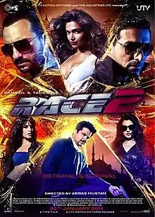 Race 2 is a 2013 Indian Hindi-language action crime film directed by Abbas–Mustan and written by Kiran Kotrial and Shiraz Ahmed. The film was produced by Ramesh S. Taurani under the Tips Industries banner, with UTV Motion Pictures serving as distributor and presenter. A sequel to the 2008 film, Race and the second installment of the Race film series, the film stars Saif Ali Khan, John Abraham, Deepika Padukone, Anil Kapoor, Jacqueline Fernandez, Bipasha Basu and Ameesha Patel. The music of the film is composed by Pritam, Yo Yo Honey Singh and Salim–Sulaiman. The film was dubbed in Tamil and Telugu.