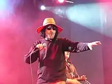In 2008 he performed with the band Dengue Fever.[24] He was described as a ""wild Algerian punk fan" performing among a lineup which read like a "Who's Who of West African music", and was part of "Africa Express", a response to the lack of African musicians at Bob Geldof's Live 8 musical extravaganza.[25]
