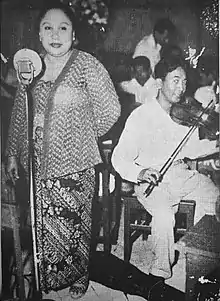 After fleeing her home she was accepted into a Wayang kulit (shadow puppet) troupe in Yogyakarta and started to be known as a singer.[1] She then joined a Ketoprak (traditional Javanese theatre) troupe which toured Central Java, and then a Wayang orang group.[5] She gradually became well known as a singer of Keroncong music, a popular genre of the late colonial era, due to her non-stop touring and performances in night markets around Java.[1][3] During the 1930s she recorded sides of Kroncong music for His Master's Voice.[1] During the Japanese occupation of the Dutch East Indies, Keroncong and comedic plays (Sandiwara) were among the only popular forms of entertainment which could still be performed, and Srimulat continued her rise in popularity through the series Bintang Soerabaia (Stars of Surabaya) and for her musical performances.[2][6] She met her future husband Teguh Slamet Rahardjo (born Kho Tjien Tiong), then a musician in a Keroncong orchestra, in 1946 and they began to perform together regularly, to the point that he adopted her name as his stage name: Teguh Srimulat.[4][3] They were married in 1950.[4] In 1950 they established their touring troupe, called variously Kerontjong Avond, Srimulat Review and Gema-Malem Srimulat; they performed most often in Surabaya.[2][3] They also regularly performed in night markets around Java.[3]
