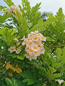 Radermachera is a genus of about 17 species of flowering plants in the family Bignoniaceae, native to southeastern Asia. They are evergreen trees reaching 5โ40 m tall, with bipinnate or tripinnate leaves, and panicles of large bell-shaped, white, pink, pale purple or yellow flowers 5โ7 cm diameter.