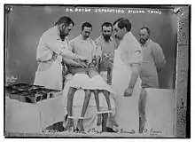 The twins had been traveling for almost a decade when Dudhika was found to have tuberculosis in 1902. A prominent French doctor, Eugène-Louis Doyen, offered to perform a surgical separation in hopes of saving Radhika's health. The surgery was filmed (as other procedures by Doyen had been). There was concern afterward that the surgeon had been distracted or hasty, because of the cameras and his ambition for good publicity. "The practice of medical heroics on Radica and Doodica's bodies," comments a recent historian, "can be understood as the spectacularization of medical superiority."[8]