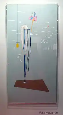 Macarrón uses a wide range of materials in his works, including acrylic, gouache, and oil paints, pencils and markers, and aerosols, aluminum, and PVC.[1][11] His influences include Roberto Matta, Jean Dubuffet, Alfonso Fraile, and Bonifacio Bembo, and is works have drawn comparisons with Joan Miró, Jean-Michel Basquiat, and Pablo Picasso.[1][7][10][12][13][14]