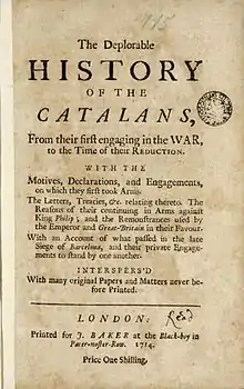 - Baker, J: Deplorable History of the Catalans : from their first engaging in the war, to the time of their reduction with the motives, declarations, and engagements, on which they first took arms, the letters, treaties, .... London, 1714