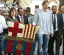 (left to right) Football captain Carles Puyol, club president Sandro Rosell, former FCB basketball player Roger Grimau and football manager Pep Guardiola deposit wreaths and floral decorations at the foot of the Rafael Casanova monument.