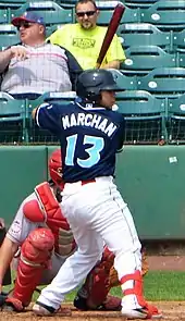 In 2018, Marchan was promoted to the Williamsport Crosscutters of the Low–A New York-Penn League (NYPL), where he drew praise from his coaches as both a catcher and a batter: in addition to improving his ability to handle pitchers and call games from behind the plate, by the NYPL All-Star game in August, the switch-hitting Marchan was batting .297 left-handed and .325 right-handed.[5] Marchan appeared at the All-Star Game that summer, successfully reaching base in five of his six plate appearances.[6] At the end of the year, leading the team with nine stolen bases and fourth in the NYPL with a .301 batting average, Marchan was named the Crosscutters' most valuable player (MVP).[7]