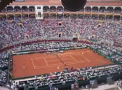 National and international representationDavis Cup![]() Nadal plays Andy Roddick at the Las Ventas bullring in Madrid, Spain during the 2008 Davis Cup semifinals. A clay court was specially constructed within the arena for the event.[34] Nadal played with La Armada in 2004, 2005, 2006, 2008, 2009, and 2011 winning the trophy in 2004, 2008 and 2009, as well as in 2011 and 2019 and fighting to remain in the World Group in 2005 and 2006. He was not able to play the final of the 2008 Davis Cup due to an injury of his left knee but he later received a replica of the cup given to the members of the Spanish team which played in Argentina, being David Ferrer, Marcel Granollers, Feliciano López and Fernando Verdasco. Finals (4–0)