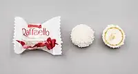 Raffaello is a spherical coconut–almond truffle that Italian manufacturer Ferrero brought to the market in 1990.[1] It consists of a spherical wafer which is filled with a white milk cream and white blanched almonds. It is then surrounded by a coconut layer. It does contain lactose, making Raffaello incompatible for consumers with lactose intolerance.