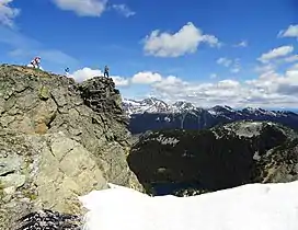 The Raft West and Raft Peak Forest Service Roads provide access to the south side of the mountain. Check in advance for logging activity. Some sections of this road require four-wheel drive and high clearance. It is nearly 22 km (13.7 mi) to the end of the road at 1,865 m (6,119 ft). A hike of about 2.5 hours goes up the meadows to the west ridge, then to the summit. An all-day hike crosses the five summits.