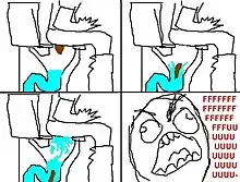 A rage comic is a short cartoon strip using a growing set of pre-made cartoon faces, or rage faces, which usually express rage or some other simple emotion or activity.[1] They are usually crudely drawn in Microsoft Paint or other simple drawing programs, and were most popular in the early 2010s.[2] These webcomics have spread much in the same way that Internet memes do, and several memes have originated in this medium. They have been characterized by Ars Technica as an "accepted and standardized form of online communication."[3] The popularity of rage comics has been attributed to their use as vehicles for humorizing shared experiences.[4] The range of expression and standardized, easily identifiable faces has allowed uses such as teaching English as a foreign language.[5]