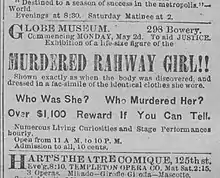 May 1, 1887 New York Dispatch advertisement for a life-sized display of the unknown woman at the Globe Dime Museum.