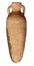 From the 3rd to mid-6th centuries Zafar was a bustling international centre with a booming local and international trade. Yule estimated a 4th-century population of some 25,000, based partly on the surface area and population density.[9] Evidence of trade comes in the form of Late Roman period amphorae such as that depicted below. Many were produced in Aqaba, Jordan as we know from excavations there. Aqaba was a center where goods were loaded, re-packed and re-exported. About 500 such sherds and vessels came to light in Zafar, the number rivalling that at Adulis and Aqaba.[10] While wine is often mention as an import, livestock, textiles, meat, fish and fish sauce were also imported.