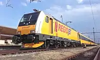 Rail transport in the Czech Republic carried 193.5 million passengers in 2019,[2] and 68.37 million tonnes of cargo in the year 2009.[3] The majority of passenger services run nowadays are operated by the state company České dráhy (Czech Railways), which until 2007 also managed cargo services now run by ČD Cargo. In 2009 the country had 9,420 km of standard gauge track, 3,153 km of which is electrified.[3] There are two main electrification systems in the Czech Republic, 3 kV DC in the northern part, and 25 kV 50 Hz AC in the south (in addition, one historical 24 km long line uses 1.5 kV DC; and since 2009 one short local line to Austria uses 15 kV 16.7 Hz AC). Locomotives had to be changed on boundaries in the past, two-system locomotives have been introduced in 1974. The network has same gauge links to all four countries bordering the Czech Republic (Slovakia, Austria, Germany and Poland) with passenger services to all four countries in operation. Major hubs for international passenger services on the network are in Prague, Ostrava, Brno and Břeclav,[4] and the busiest station (by number of passengers) is Praha hlavní nádraží. Maximum speed on Czech rails is 160 km/h (99mph).