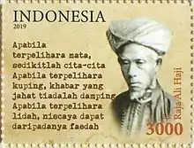 Raja Ali Haji bin Raja Haji Ahmad (1808/9–1869/75) was a 19th-century Bugis-Malay historian, poet and scholar who wrote Tuhfal al-Nafis.[1][2] He was elevated to the status of National Hero of Indonesia in 2004. Haji has been described as one of the most important Malay writers of the 19th century.[3]