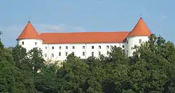 Mokrice Castle is a castle on a hill above the right bank of the Sava River in the northern part of the settlement. It was first mentioned in written documents dating to 1444, but the site has been occupied since Roman times. The castle was rebuilt in 1560 and is a three-storey rectangular building with a central arcaded courtyard and three defence towers. The castle chapel is dedicated to Saint Anne. The building has now been adapted and operates as a four-star hotel.[3]