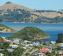 Goat Island/Rakiriri with Port Chalmers in the foreground and Otago Peninsula in the background