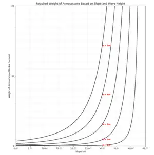 The weight of the armourstone is proportionally related to the cube of the wave height, emphasising the significant increase in stone weight as wave height increases.[36]