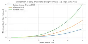 Iribarren had studied under Eduardo de Castro Pascal, who in 1933 proposed a formula for the design of breakwaters which he had developed based on earlier work by Briones.[40] The De Castro Pascual-Briones (1933) formula is: