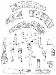 Within the box were papyri containing medical/magical texts, reed pens, and many different magically related items. These include ivory wands, a wooden female figure, an ivory figure of a boy carrying a calf, a bronze Uraeus wand entangled in hair, tiny beads, and seeds. About one-third of the papyri was not preserved, but some of the remaining texts have been translated and a large portion pertains to childbirth. The person buried here may have specialized in aiding both pregnant women and children, as many items pertain to birth magic practices.[5]