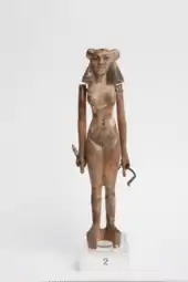 A wooden figurine of a naked masked woman was found in the tomb. The figure, 1790, 20.2 cm,[7] was originally painted yellow for the skin and black for her hair but the colors have faded. The woman holds two serpents made of metal in her hands. Her arms are separate pieces that are attached by pegs. She wears a lion's mask and looks similar to the images on the magic wands. This could possibly be a reference to the god Aha or Beset. There is a small hole on her forehead, where there was once an attachment of some kind. The base of the figurine had been reshaped during antiquity.[18] A discovery of magically-related items similar to this box was found in Kahun. Petrie discovered a Beset mask at this site, suggesting that magicians could have taken on the embodiment of this goddess.[12]
