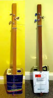 The Ramkie (also called an Afri-can) is a type of guitar usually made in South Africa, Botswana, Zambia, Namibia and Malawi. It is made using a discarded oil can (or similar) for the soundbox. It has three or four strings (rarely six like a guitar), made of fishing wire or bicycle brake wire, and may be fretted or fretless.[1][2][3][4] The instrument has apparently always been used for repetitive chord-playing, not melodic patterns.[5]