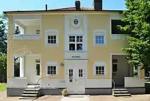 - Villa Malva was built around 1880 and is a wooden building clad in yellow painted horizontal panels. The house is on one and a half floors with a gable roof clad in red fiber cement tiles and the gable ends and the underside of the eaves clad in seam panelling with sawtooth frieze. The main entrance is located on the house's southern long side and is accentuated by a frontispiece, as well as a porch with a balcony above. Both gables have extended rooms with balconies on the roof. The building probably replaced a building on the same site that burned down in 1879 and consists of seven rooms on the ground floor and six rooms on the upper floor. The building became a listed building in 1973 and in 1977 the interior was converted to house three apartments.[63]