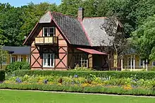 - The two-and-a-half-storey accountant's villa was built in 1829 in yellow plaster. The gable end is clad in chamfered paneling with sawtooth frieze, which, like the building's joinery, is painted brown. The windows, on the other hand, are painted white and are of the central mullion type with glazing bars, where those in the gable ends have white painted coverings. At the main entrance, on the north long side, the villa has an extended porch with an overhanging balcony with glazed sides, which in turn is covered by a small projected gabled roof. Above the balcony is a smaller paneled frontispiece, which has a similar counterpart on the opposite side of the house.[68]