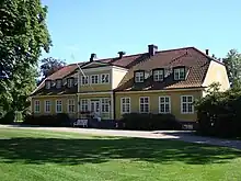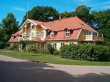 - Villa Malva was built around 1880 and is a wooden building clad in yellow painted horizontal panels. The house is on one and a half floors with a gable roof clad in red fiber cement tiles and the gable ends and the underside of the eaves clad in seam panelling with sawtooth frieze. The main entrance is located on the house's southern long side and is accentuated by a frontispiece, as well as a porch with a balcony above. Both gables have extended rooms with balconies on the roof. The building probably replaced a building on the same site that burned down in 1879 and consists of seven rooms on the ground floor and six rooms on the upper floor. The building became a listed building in 1973 and in 1977 the interior was converted to house three apartments.[63]