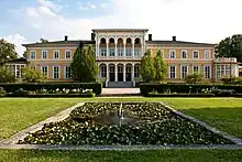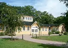In 1824, von Platen transferred the well to Colonel Carl von Dannfelt for 18,000 riksdaler and soon Dannfelt also owned the majority of the well's shares.[27] Dannfelt built on what von Platen had started; for example, he rebuilt the bathhouse at Öresund and a new hospital was built in the eastern side of the area with room for 80 patients. The park was further refurbished in the romantic English style, with walkways designed to attract visitors.[28] During this time, entertainment was lively and several balls and concerts were held at the well, guests could rent horses for excursions, and there were opportunities for card and billiard games. In 1824, Charles XIV John visited the park and the possibility of building a special residence for the royal family was discussed when they visited the well.[29] But when the plans were presented in Stockholm the following year, the king had changed his mind and instead chose to donate a sum of 8,000 riksdaler to the park, to be used to subsidize stays for those who could not afford to rent the well themselves.[29] This donation laid the foundations for what was to become the well hospital, which was completed in 1835. It became one of the most lavish buildings in the park and housed 46 hospital beds.[30] In 1828, Queen Désirée visited the well and in her honor Dannfelt had a "Queen's Garden" planted in front of the house she lived in, now known as Villa Desideria.[25]