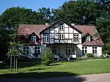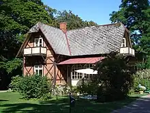 - The two-and-a-half-storey accountant's villa was built in 1829 in yellow plaster. The gable end is clad in chamfered paneling with sawtooth frieze, which, like the building's joinery, is painted brown. The windows, on the other hand, are painted white and are of the central mullion type with glazing bars, where those in the gable ends have white painted coverings. At the main entrance, on the north long side, the villa has an extended porch with an overhanging balcony with glazed sides, which in turn is covered by a small projected gabled roof. Above the balcony is a smaller paneled frontispiece, which has a similar counterpart on the opposite side of the house.[68]