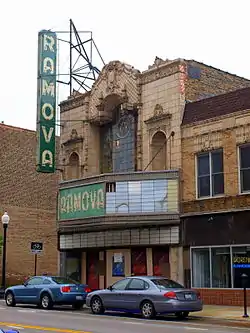 The Ramova Theater is a historic movie theater at 3508-3518 South Halsted Street in the Bridgeport neighborhood of Chicago, Illinois. Businessman Jokūbas Maskoliūnas, one of the many Lithuanian immigrants who settled in Bridgeport in the early twentieth century, built the theater in 1929. The theater opened with 1,300 seats, making it the largest in the neighborhood, and was built with a commercial block and apartments in the same building. Its name, which was chosen by the winner of a local newspaper contest, means "peaceful place" or "serene place" in Lithuanian. Architect Myer O. Nathan designed the building as an atmospheric theater, a style of theater meant to transplant audiences to a distant place or time; in the case of the Ramova, its interior used false fronts and balconies to resemble a Spanish courtyard. Nathan's design included elements of Neoclassical and Spanish Revival architecture, such as extensive terra cotta ornamentation, a frieze spanning the length of the building, and plaster detailing on the interior.[2]