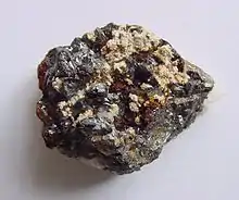- Galena PbS: Galena occurs as dull grey cubes with sphalerite and fluorite.[8]