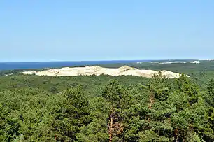 The site consists of set of dunes, brackish lakes, bogs, and wetland forests on the southern Baltic Sea coast between Łeba and Rowy, Poland.[5][4] The coastal aeolian processes have produced some of the most extensive and active mobile sand dunes, which can reach 30 m (98 ft) high, on the Baltic Sea.[3] Coastal erosion and other geo-morphological processes lead to the creation of sand-bars, forming brackish lakes and bogs.[3] The area consists of a series of vegetation zones going from the sand communities of the coastline towards the forests of the mainland.[3] The forest includes beech (Latin: Fagus sylvatica), birch (Latin: Betula pubescens), alder (Latin: Alnus glutinosa), pine and oak. It is an important way station for migrating wader birds and waterbirds such as geese, ducks and swans.[3] The white-tailed eagle (Latin: Haliaeetus albicilla) and other birds nest at the site.[3][8][9]