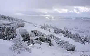 The site consists of three subalpine zone bogs along the Czech border, in the Karkonosze Mountains.[3] The bogs are located at the watershed dividing the Baltic Sea and North Sea basins.[5][4] The bogs themselves support an extensive algal community while the surrounding area consists of dwarf Mountain pine (Latin: Pinus mugo) and low-growth vegetation.[3][4]