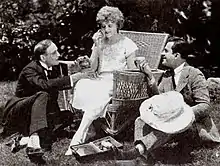 Ramsey Wallace, Miss DuPont (doing her make-up), and Jack Perrin on set in The Rage of Paris (1921)