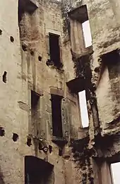 Ramstein Castle consists of an inner bailey and its associated domestic buildings on an oval area measuring roughly 37 × 57 metres.[12] Of the former enceinte (curtain walls and corner towers) few remains survive. The Gothic castle is a tower house with a trapezoidal ground plan measuring 13 × 10.8 metres.[13] It is estimated that its outer walls, 1.35 metres thick and made of rubble stone, were once 25 metres high and had four storeys.[13] Of the latter, only two and parts of another survive; the maximum height is 18 metres.[13] On the inside of the walls, holes for the former ceiling beams and the remains of seat niches and chimneys can be made out. The embrasures are made of grey and red sandstone quarried locally. Most of the tower windows have Gothic trefoil surrounds.