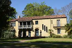 The Randolph James House is a historic house at 1212 North Madison Avenue in El Dorado, Arkansas. The two-story stuccoed house was designed by Mann & Stern, and was built in 1927 for Randolph James by his father George, a principal in the local Exchange Bank who benefited from the city's oil boom in the 1920s. The house is a fine local example of Spanish Mission Revival styling, with wrought iron balconies, tile roof, stucco walls, and varied windows.[2]