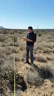 Range Management graduate research assistant recording line point intercept data on southern New Mexican rangeland.
