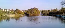 In addition to the lake, which is used for angling, there are several amenities provided within the park. In the southern part of the park is a bandstand, and then near the end of the lake is a rockery which is used by the Romford Summer Theatre.[5] Beyond this point the park widens to the east, and there are sports pitches (football in winter and cricket in summer) and sunken tennis courts, the sunken nature of which is reputed to be the result of sand having been dug there for use in construction of the surrounding houses.[6] To the north of the tennis courts is a children's play area which was remodelled in 2009, the circular play area plus tennis courts having previously been filled with water and known as the "Spoon Pond".[7] Apart from these the park consists of parkland, mature woodland and grassland.