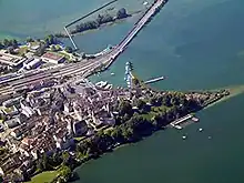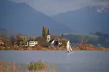 During summer, there is a ferry across Obersee.[17] The ferry connects a pier near the University of Applied Sciences Rapperswil (now part of OST), just south of Rapperswil railway station, with Lachen and Altendorf in the canton of Schwyz.